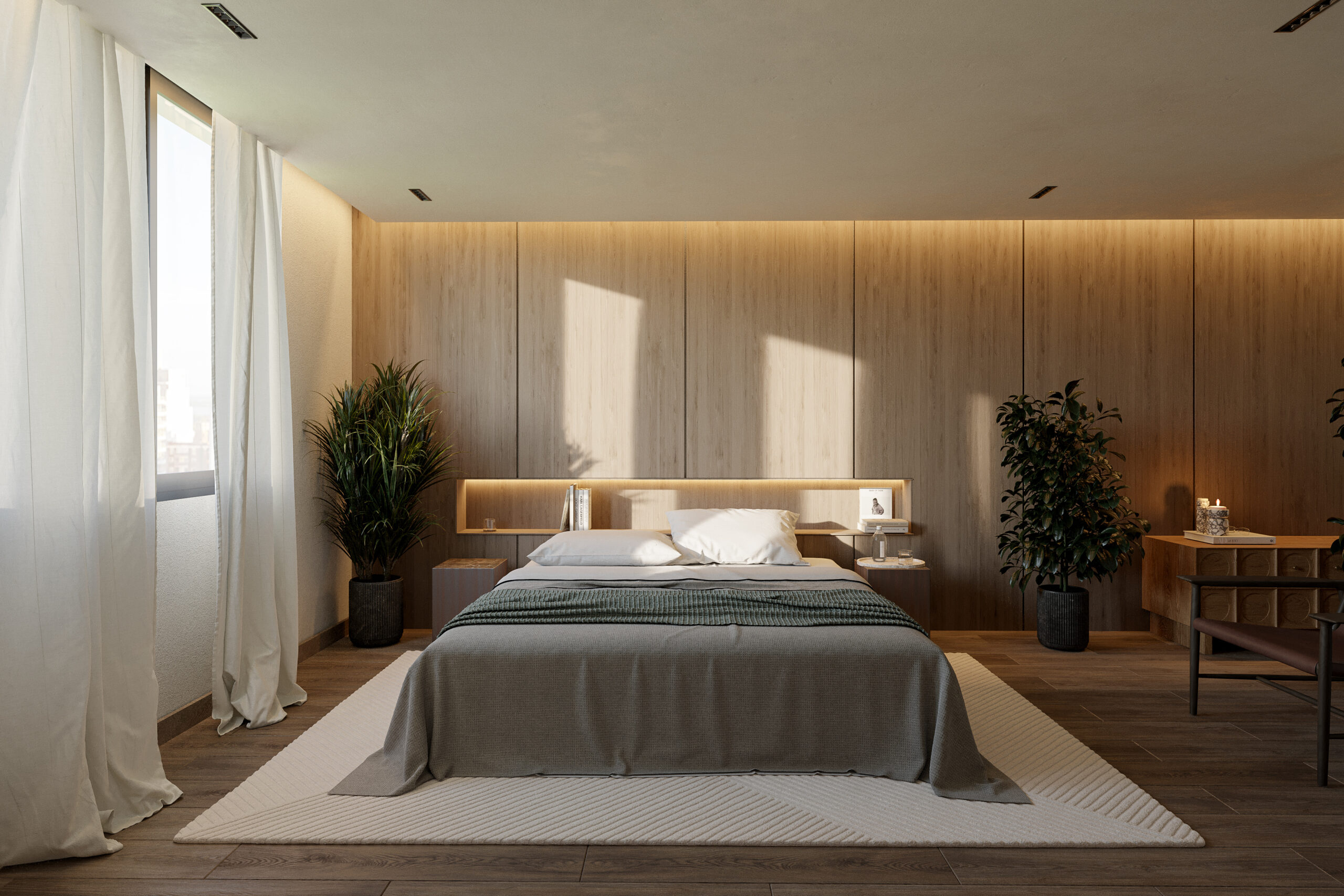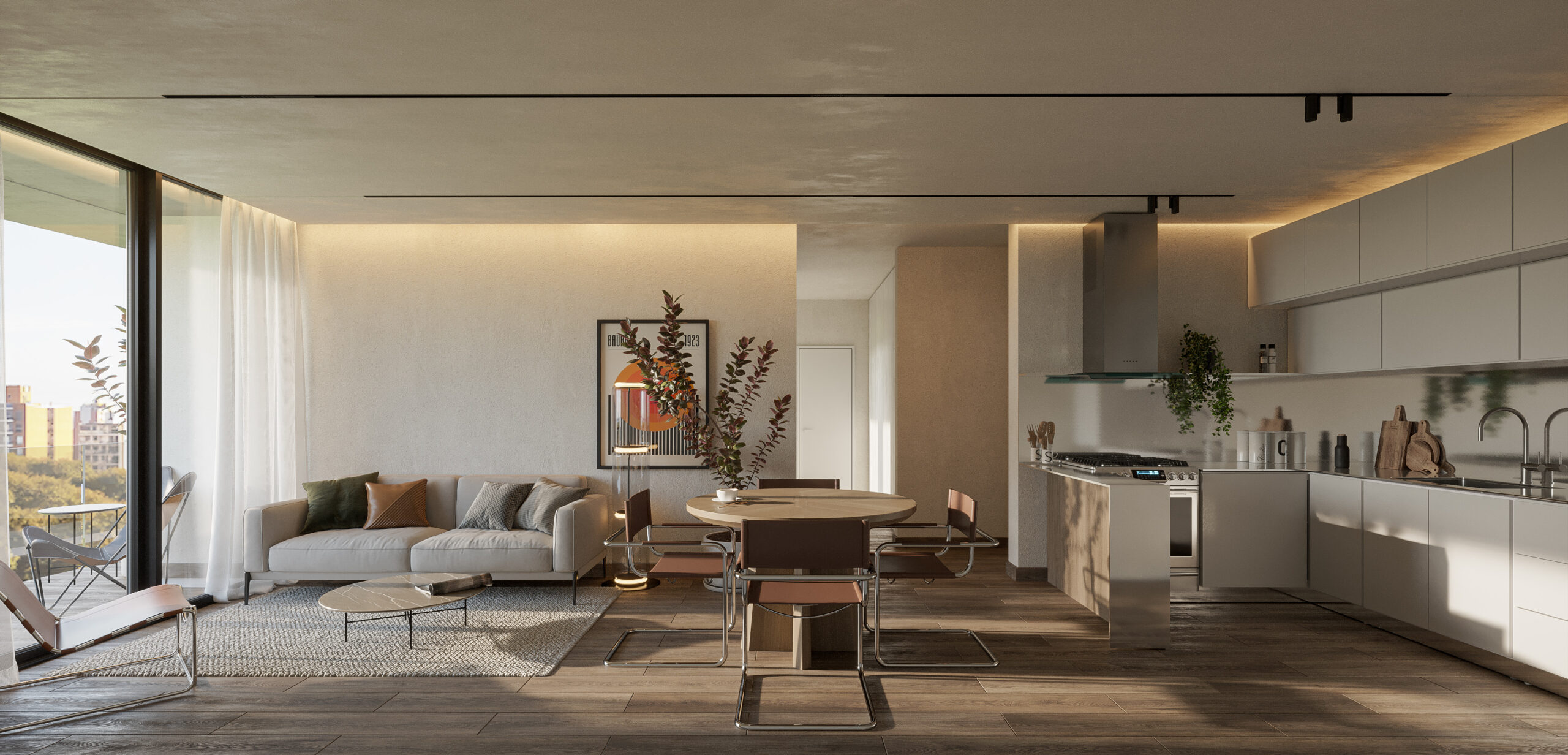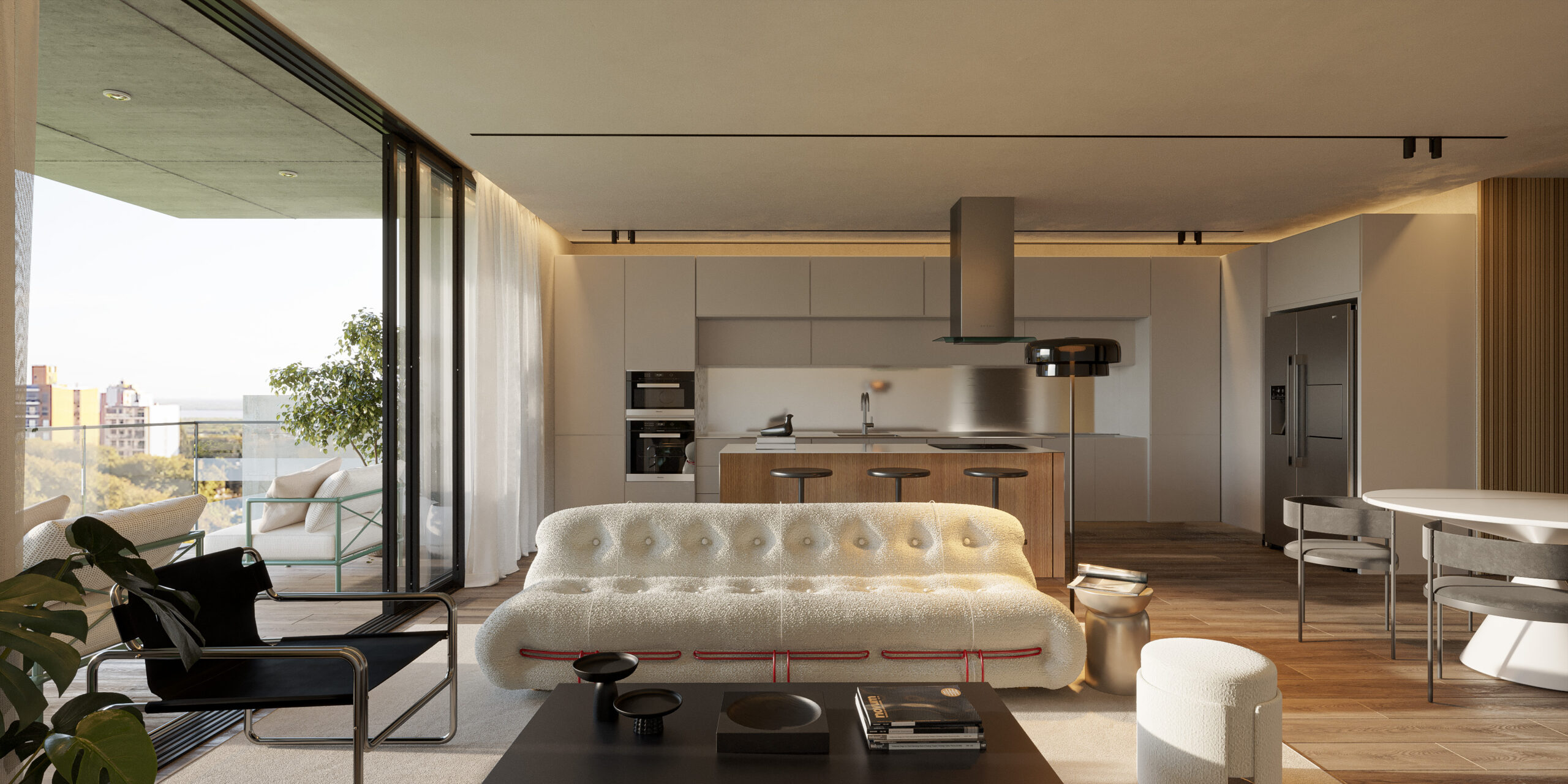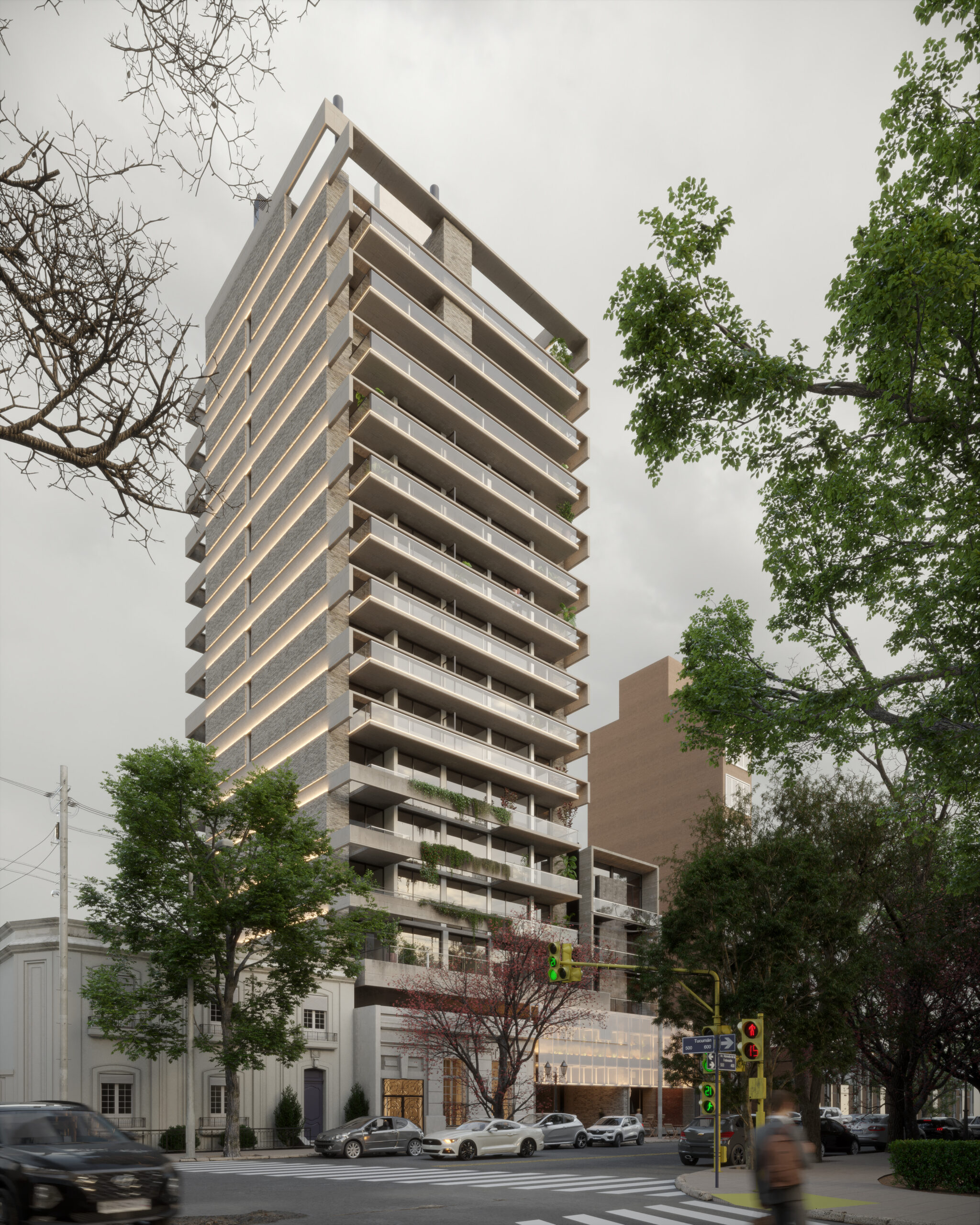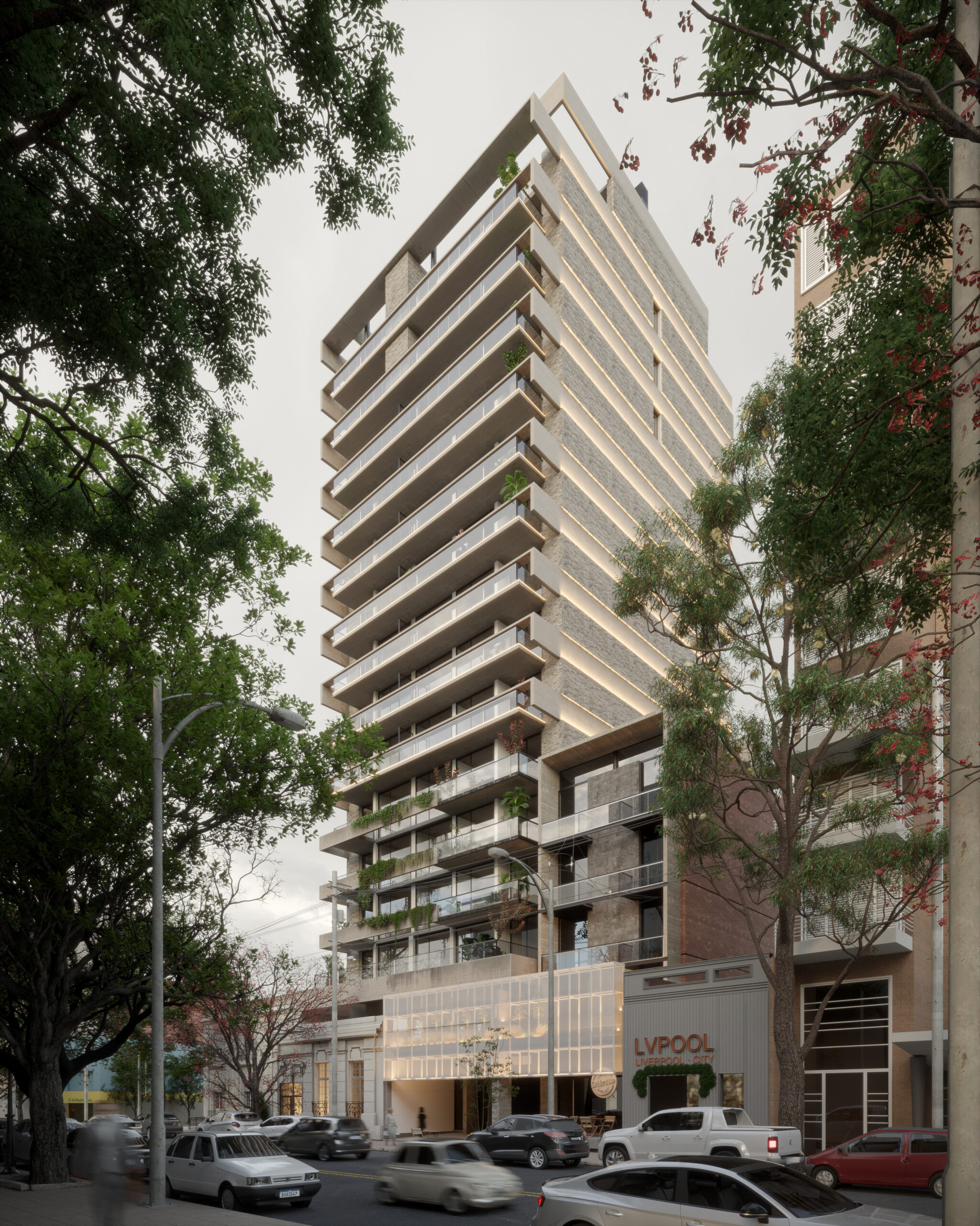 Uno de los desafíos más interesantes fue integrar la presencia del entorno: una zona con alto volumen de tránsito que no podíamos ignorar. Lo resolvimos destacando el edificio emergente y su interacción con la vegetación voluminosa que lo rodea, creando un balance visual con el entorno dinámico. Cada detalle fue pensado para mostrar cómo este proyecto se inserta armónicamente en su entorno, captando la atención de potenciales compradores.