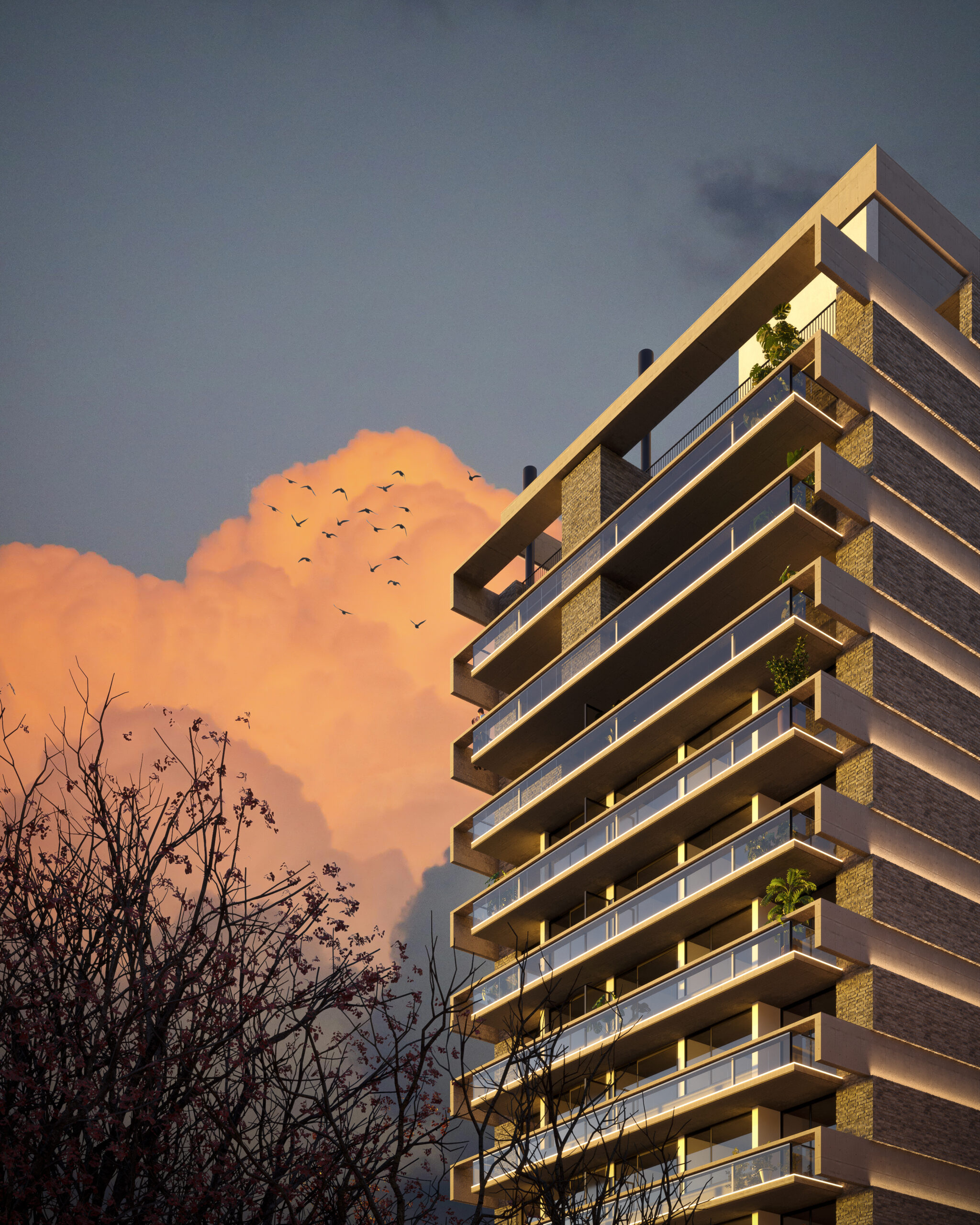 Finalmente, nos permitimos sumar una imagen especial del edificio iluminado por la calidez de un atardecer, con el objetivo de resaltar las terrazas y su inmejorable vista hacia el río, un atractivo clave en la comercialización de las unidades.